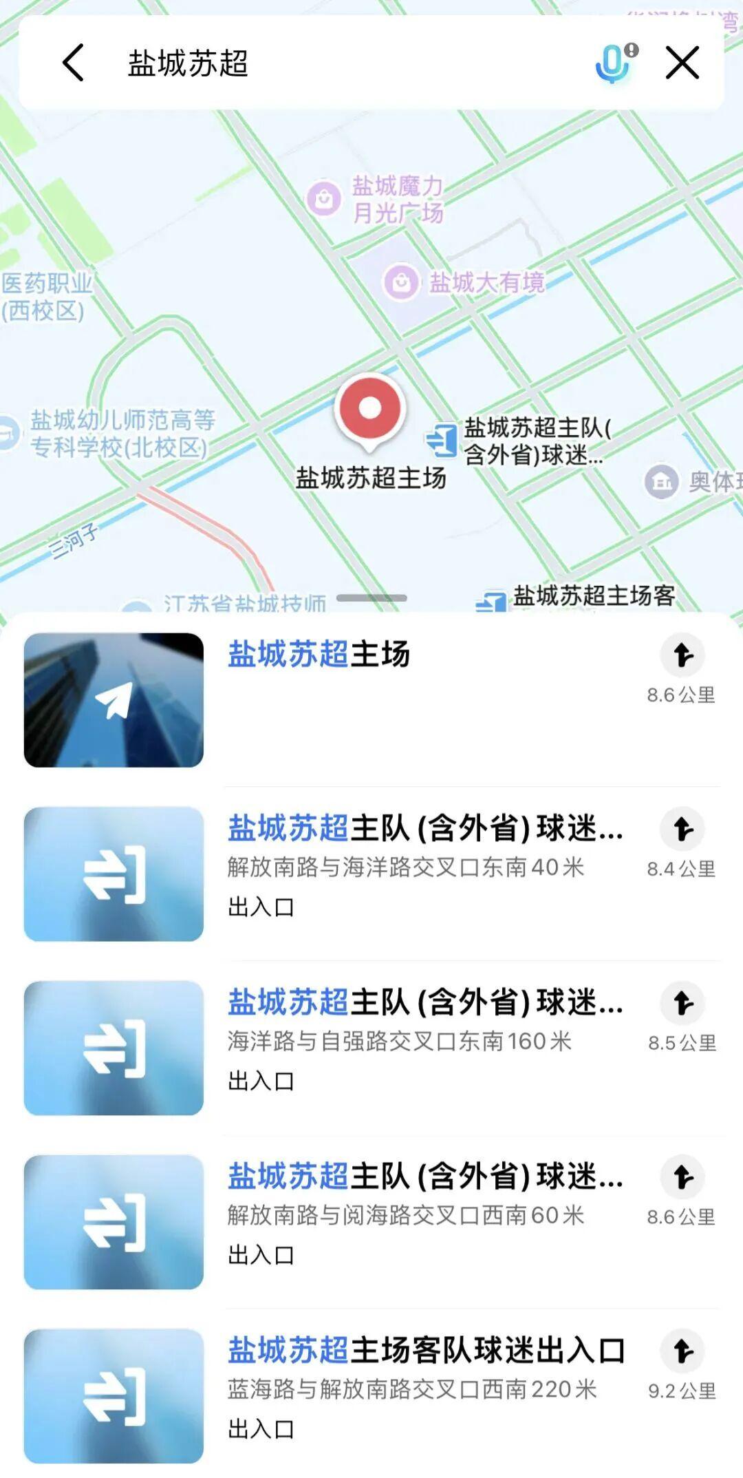 如果您自驾前往奥体中心,可使用高德地图搜索“盐城苏超”,可导航至主队或客队球迷相应出入口。建议实时掌握路况信息,提前科学规划路线。