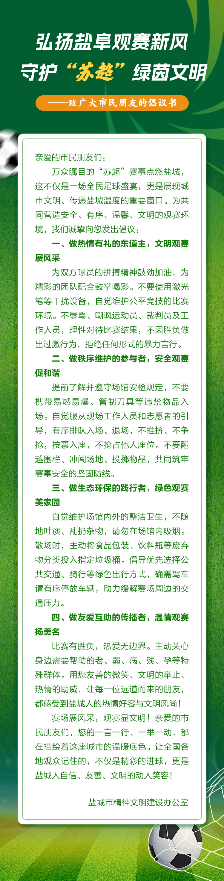 10月8日17时30分至22时00分,盐城奥体中心(解放南路287号)将举办“2025江苏省城市足球联赛(盐城赛区)盐城VS无锡”活动。为确保活动期间周边区域空中安全,杜绝各类违法违规飞行活动发生,根据相关法律法规规定,现就有关注意事项通告如下: