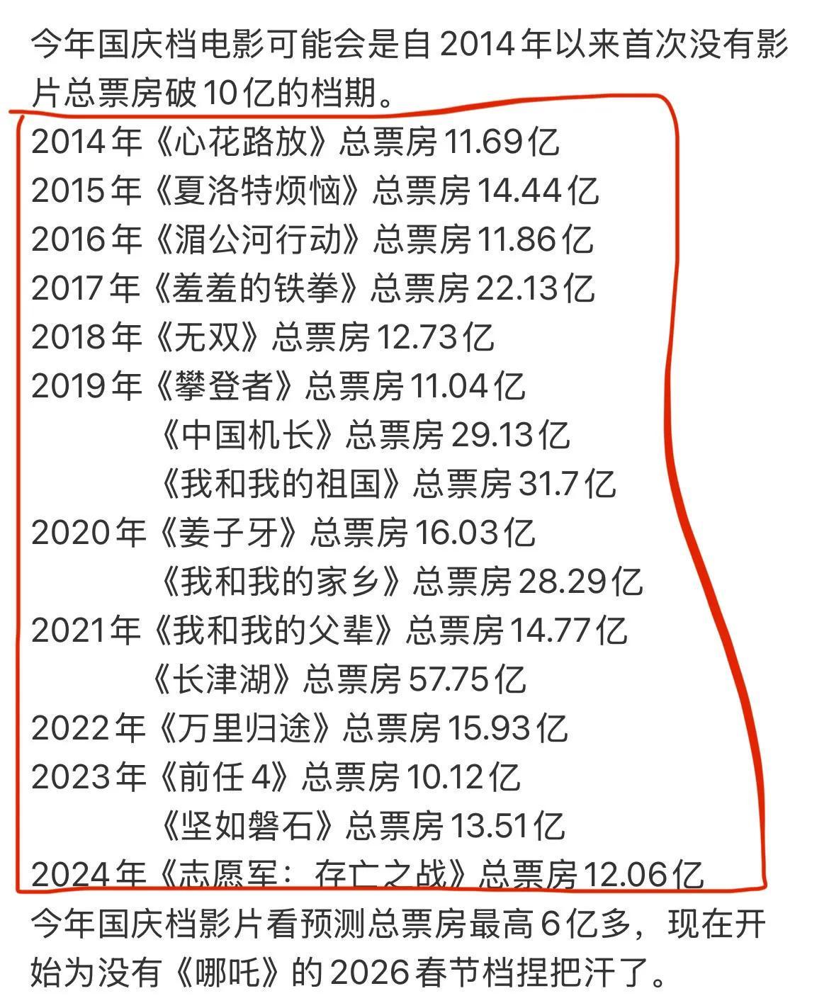 之后的这一档期,都会冲出来一部过十亿的头部电影,市场特别火热的时候,都能达50亿之多,即2021年的《长津湖》。