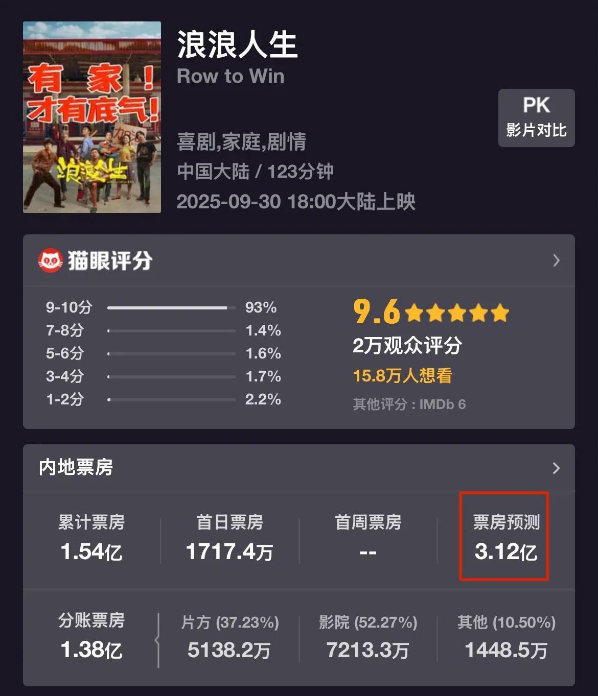 像新电影《浪浪人生》,热档期里上映6天,才过亿,权威预测最终票房落点在3亿出头。