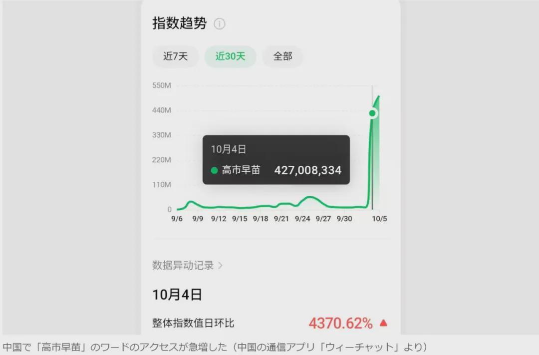 那么,这个4000%的数据究竟从何而来?《产经新闻》只是简单地从微信指数上截了个屏。而引发日本网民热议的源头,竟然正是《产经新闻》自己。
