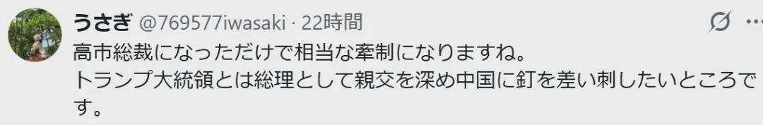 当然,也有部分日本网民对高市早苗寄予厚望,认为她若成为日本首相,将能与特朗普加深交情,给中国‘扎上钉子’。他们甚至提出‘台湾有事就是日本有事’的论调,将高市早苗视为牵制中国的重要力量。