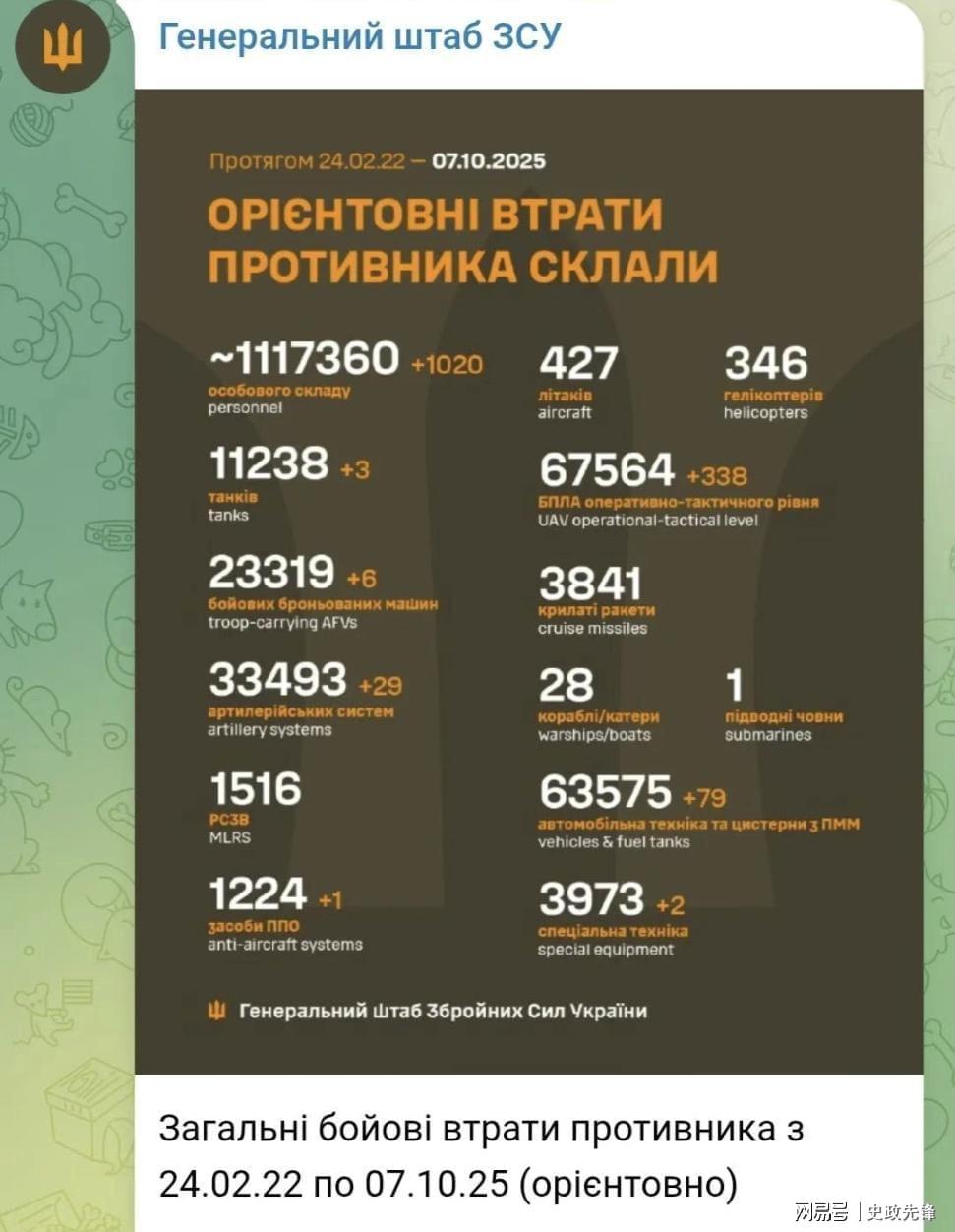 据乌总参发布的10月7日最新战报,过去一天里,俄乌军队共进行了193次交火。俄军向乌军阵地与定居点投掷了143枚滑翔炸弹,发射了4523发炮弹/火箭弹,并使用了超过5300架无人机进行侦察和攻击。乌克兰空军、导弹部队和远程炮兵则打击了俄方7个人员与装备集结地,摧毁了3个炮兵阵地、一个无人机控制站和其他多个重要目标。经过一系列战斗,乌克兰武装部队当日歼敌1020人。