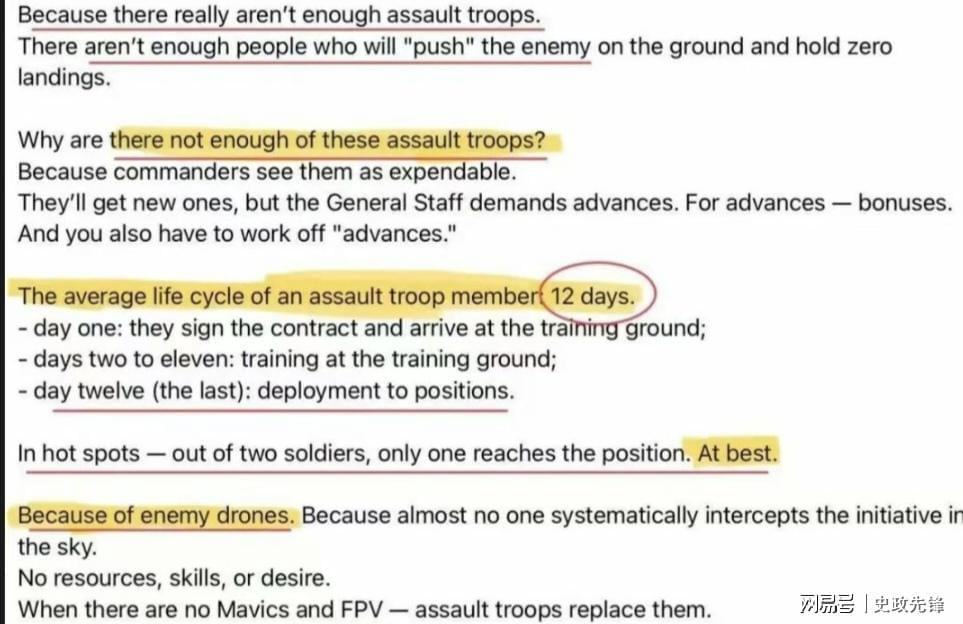 为何会出现如此高的伤亡?俄著名军事记者罗曼诺夫大胆地道出真相:俄军突击部队被指挥官视作“消耗品”,为了营造进攻与进展的假象,不惜将大量士兵投入战场。合同兵平均存活时间为12天,签约后接受10天训练,第11天就被送往前线,在乌军无人机持续杀戮下仅有50%的人能够抵达阵地。士兵参战的主要驱动力是钱,阵亡士兵家属能得到一笔远超收入的抚恤金,如果经济枯萎,战争机器会戛然而止。