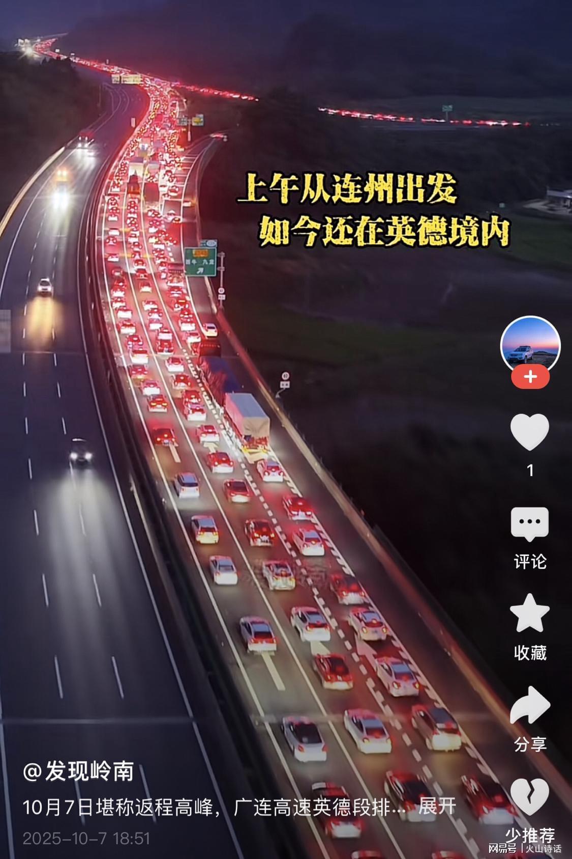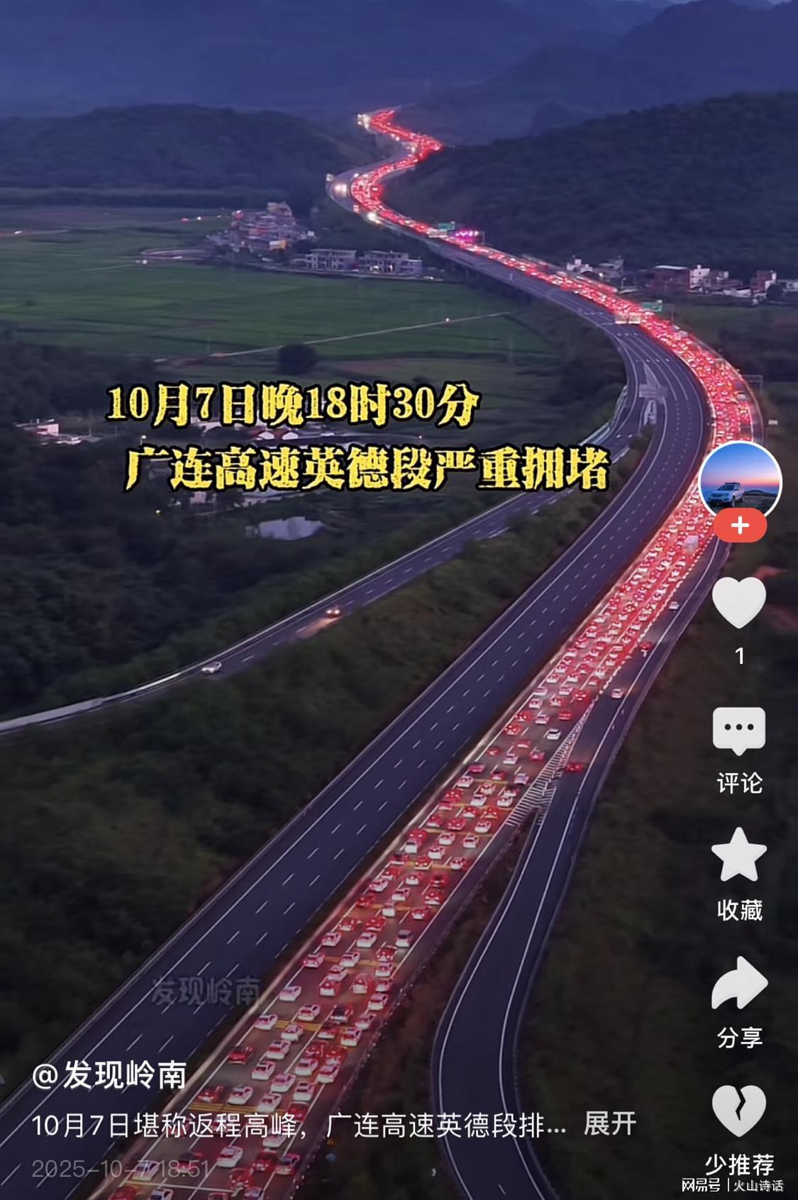 堵车潮并未止步于沈海高速。10月7日,清远到佛山路段也陷入拥堵,5小时的车程让不少车主望而却步。而当晚18点30分,广连高速英德段更是出现'全线飘红'的壮观景象,道路监控画面显示,整条高速公路俨然成了'红色停车场'。