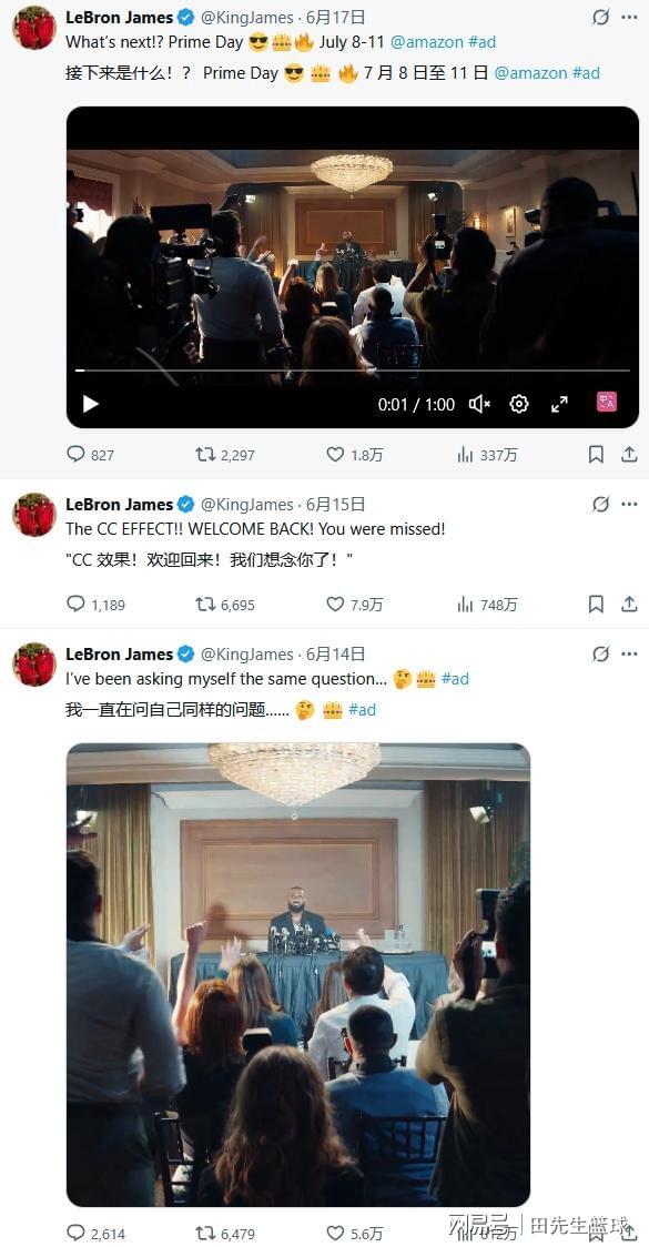 值得一提的是,这并非詹姆斯首次采用类似“退役决定”的噱头进行商业营销。早在今年6月,他就曾为亚马逊打过一次类似的广告。当时,詹姆斯发布了一则视频,视频中记者向他询问接下来的计划是什么,然而视频却戛然而止。过了三天后,詹姆斯揭晓答案,原来这是一个亚马逊Prime Day的广告。这样的营销方式,虽然能够吸引眼球,但也容易引发争议和质疑。