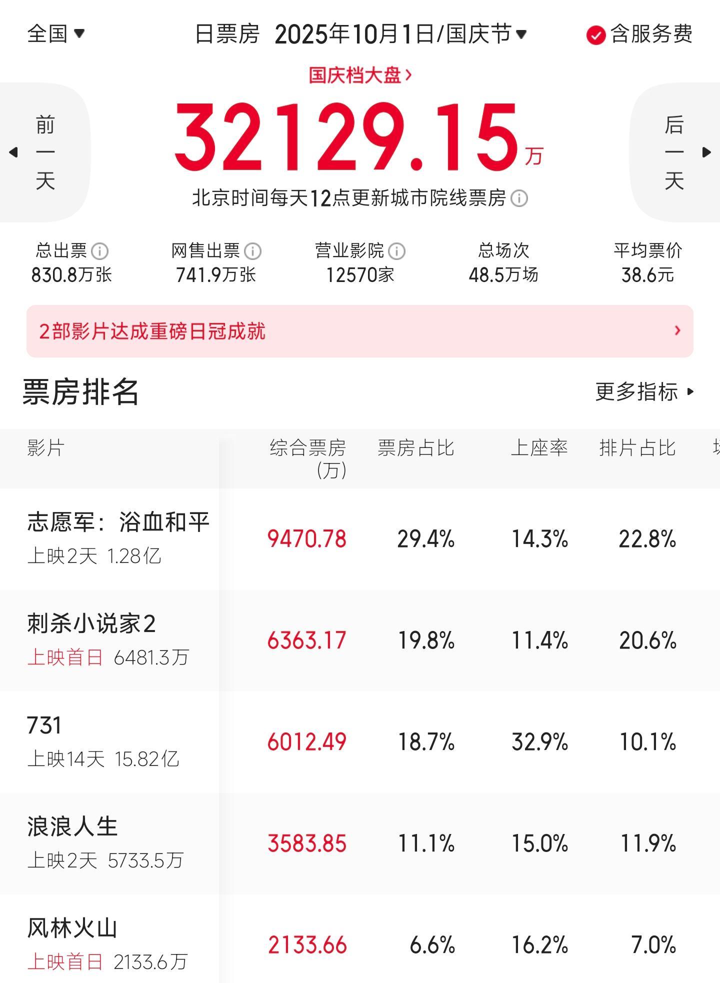 《刺2》首映日虽然排在第二位,但也只有6363万票房,被第一名的《志愿军3》断层领先。