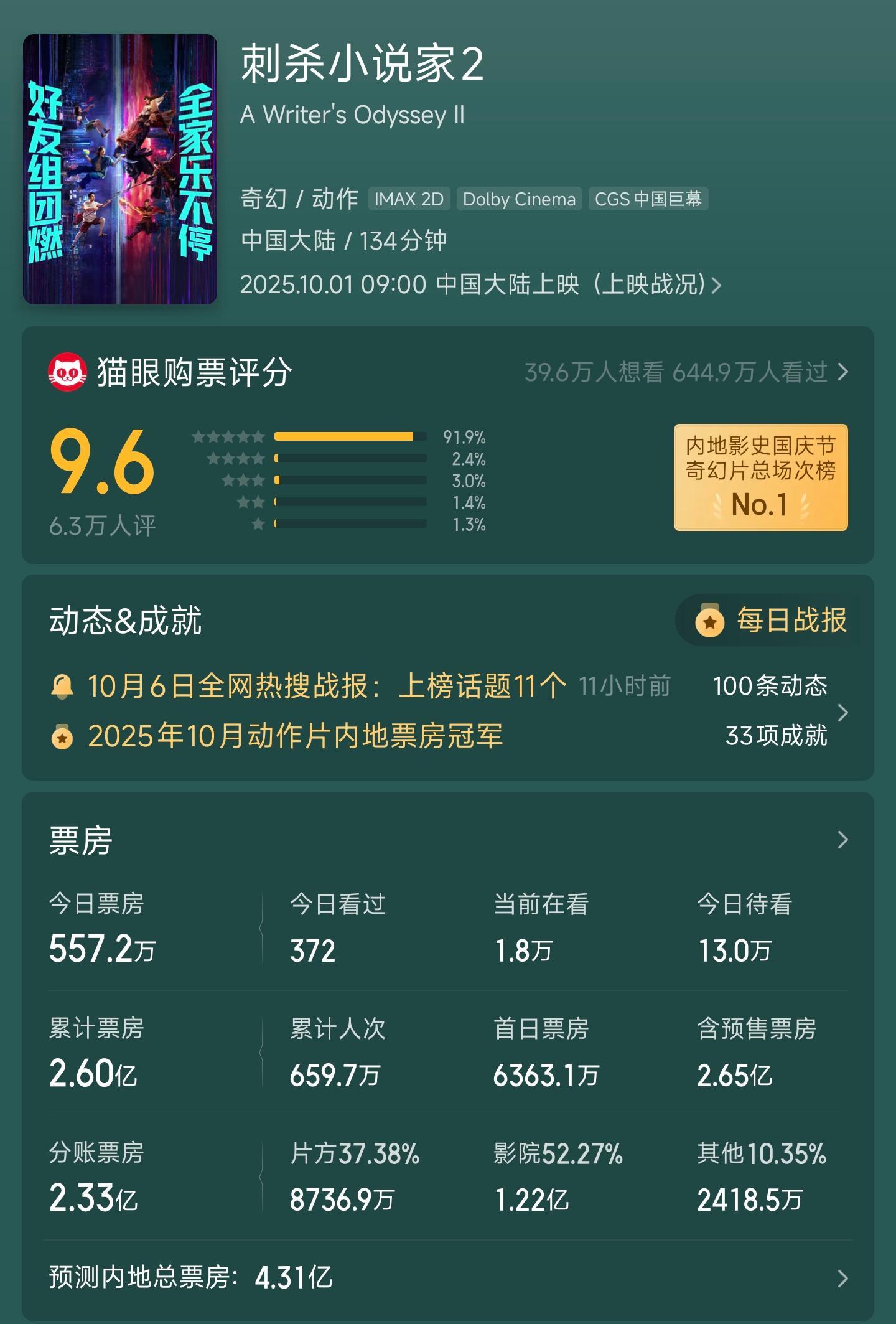 而截止到发稿前,该电影上映4天,票房1.66亿,预测最终票房在4.3亿左右。