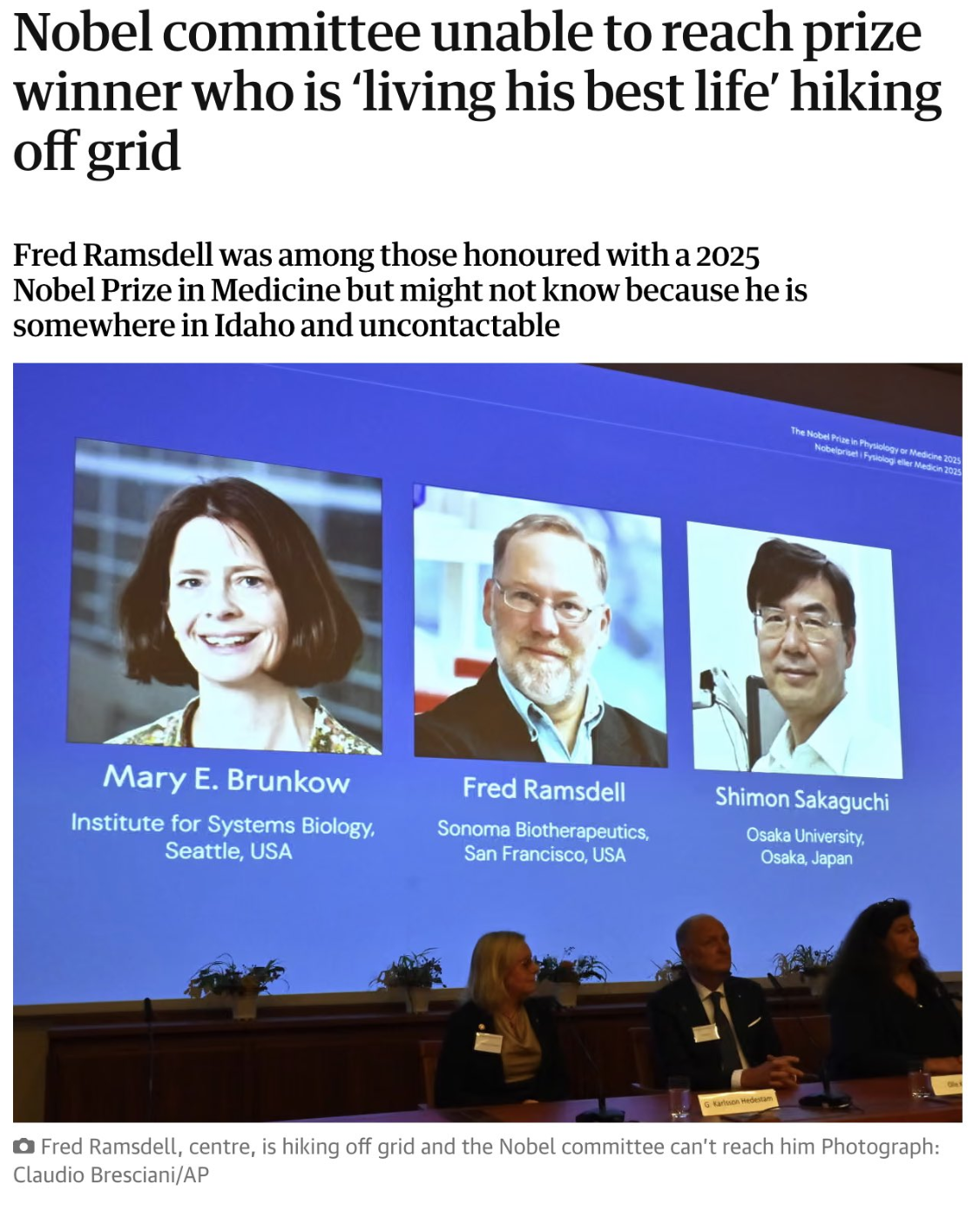 2025年诺贝尔生理学或医学奖的揭晓本应是一场科学界的盛事,然而,其中一位得主Fred Ramsdell却至今未能被诺贝尔委员会联系上。据其位于旧金山的实验室发言人透露,Ramsdell目前正处于“数字断联”状态,正在荒野中享受徒步旅行的乐趣。