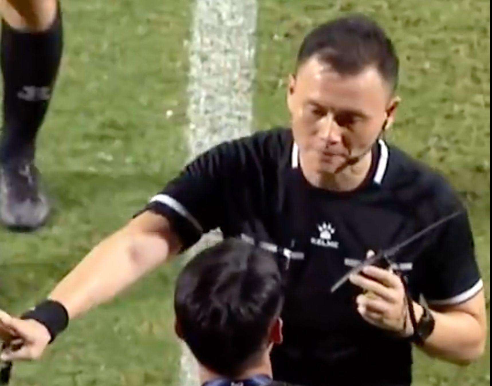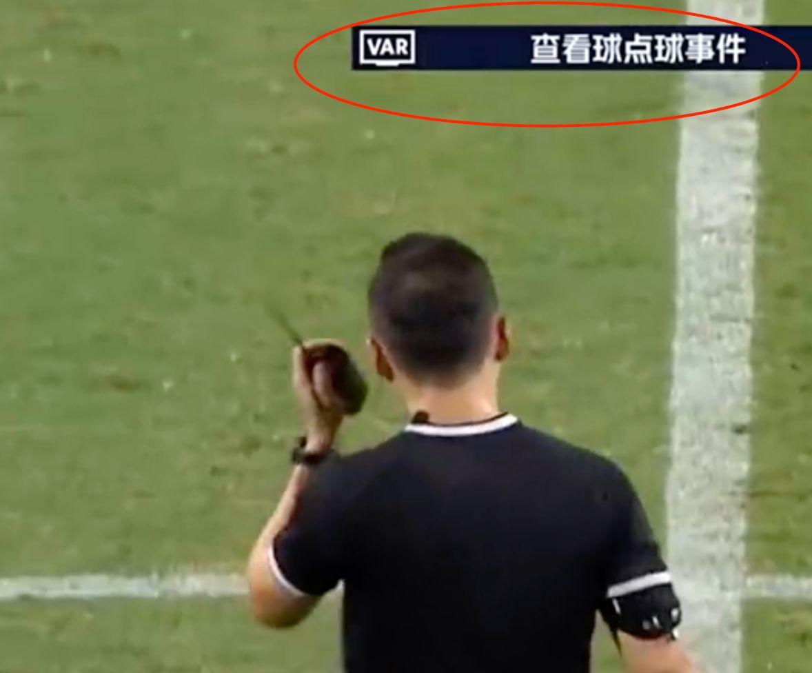 值得一提的是,在争议发生后,裁判随即叫停了比赛。此时,转播画面上出现了“VAR,查看点球事件”的提示语。然而,令人意外的是,VAR设备却呈现黑屏状态,且主裁判是通过手持对讲机与VAR裁判组进行沟通,而非通常使用的耳麦。
