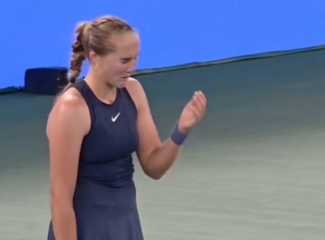 这一局,安德烈耶娃最终被破发,5局过后以2-3落后。第二盘,她以3-6落败。随后的比赛中,安德烈耶娃几乎是在边打边哭的状态下进行,每次被破发或丢分后,都会忍不住掉下眼泪,甚至多次甩掉球拍,情绪非常低落。