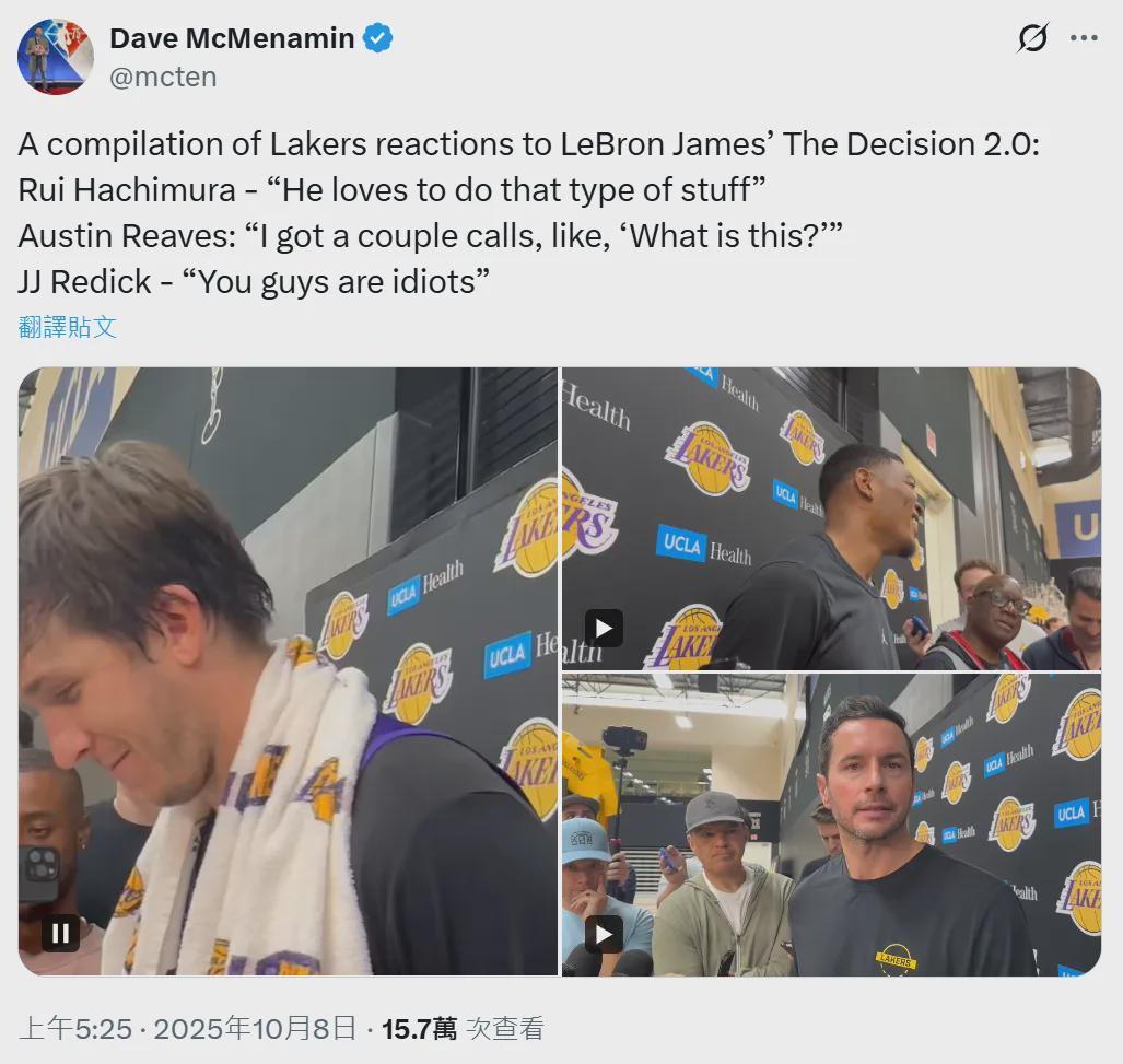 湖人球员里夫斯(Austin Reaves)表示:“我觉得他当时发布那个内容的时候,确实引发了全球关注。我也收到了几个电话,问我‘这是什么?’。显然,人们以为他要退役了,我很高兴他没有。”