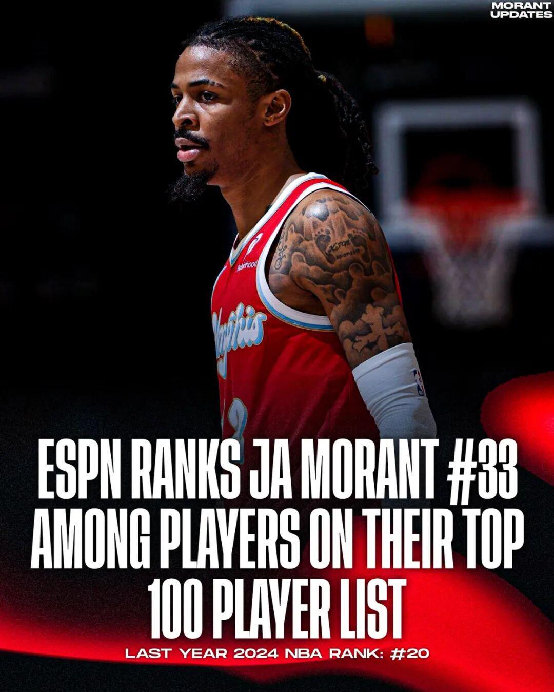 值得一提的是,在ESPN的新赛季百大球员排名中,莫兰特仅排在了第33位。作为对比,2022年打出生涯高光后,他可是在ESPN的百大中名列第9,上赛季的名次则是第20。新赛季掉到第33位,多少也能看出媒体对他的不信任和不看好。