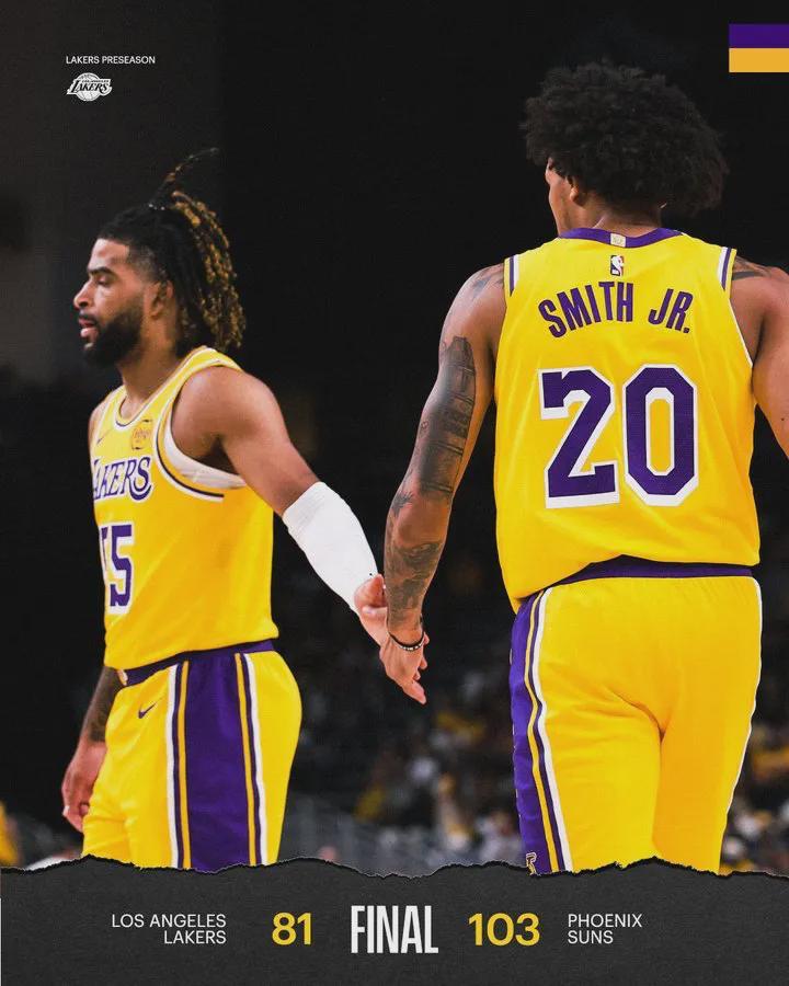 不过,这场比赛湖人队打得并不顺利。东契奇和詹姆斯两大核心均未出战,全队仿佛失去了主心骨。最终,湖人队以81比103的比分惨败给太阳队,吞下了一场苦涩的失利。