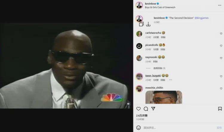 詹姆斯的好友、前队友乐福则发布了一张乔丹2003年在奇才退役仪式的视频截图,并开玩笑写了“决定二”。难道乐福知道些什么?