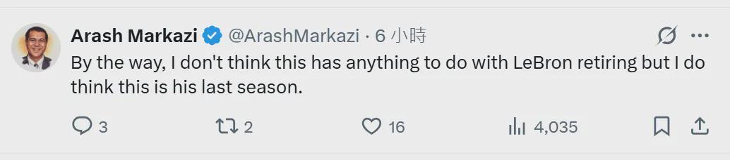 湖人跟队记者Arash Markazi表示,他始终认为这次预告与退役无关,“但我确实觉得这会是詹姆斯的最后一个赛季”。