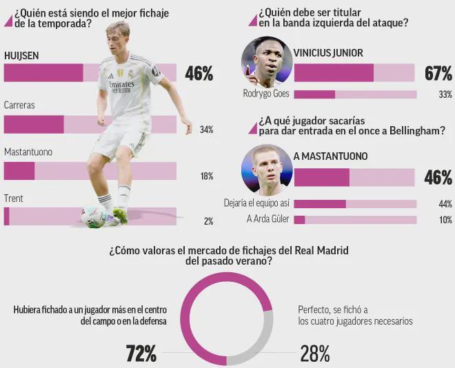 在中场球员的选择上,贝林厄姆以46%的支持率成为首选,马斯坦图诺获得44%的支持,居莱尔获得10%的支持。