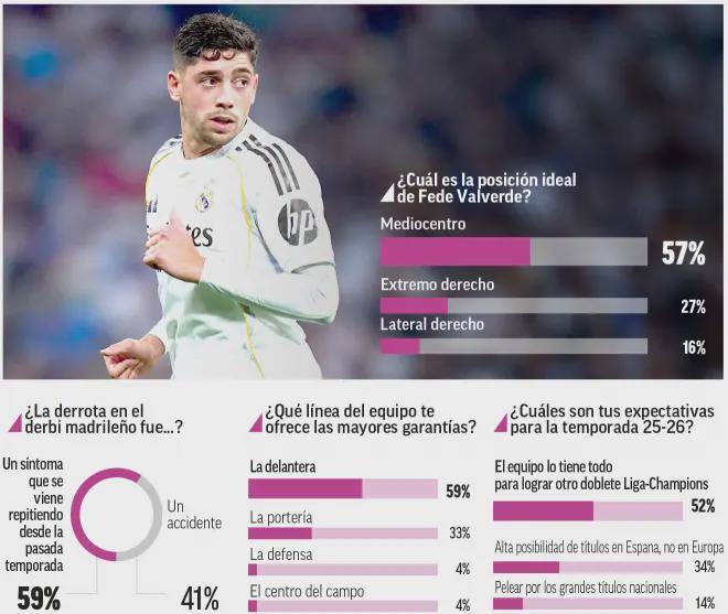 在球队赛季争冠可能性的评价中,52%的球迷认为皇马有望同时夺得西甲冠军和欧冠冠军,34%的球迷认为皇马将夺得西甲冠军,而14%的球迷则认为皇马可能颗粒无收。