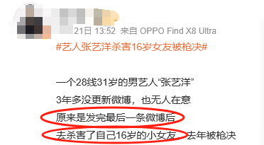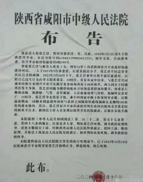 近日,还有一则令人震惊的消息引发了网友的广泛关注和讨论。据陕西省咸阳市中级人民法院布告,艺人张艺洋因杀害16岁女友被执行枪决。相关话题一度登上微博热搜。