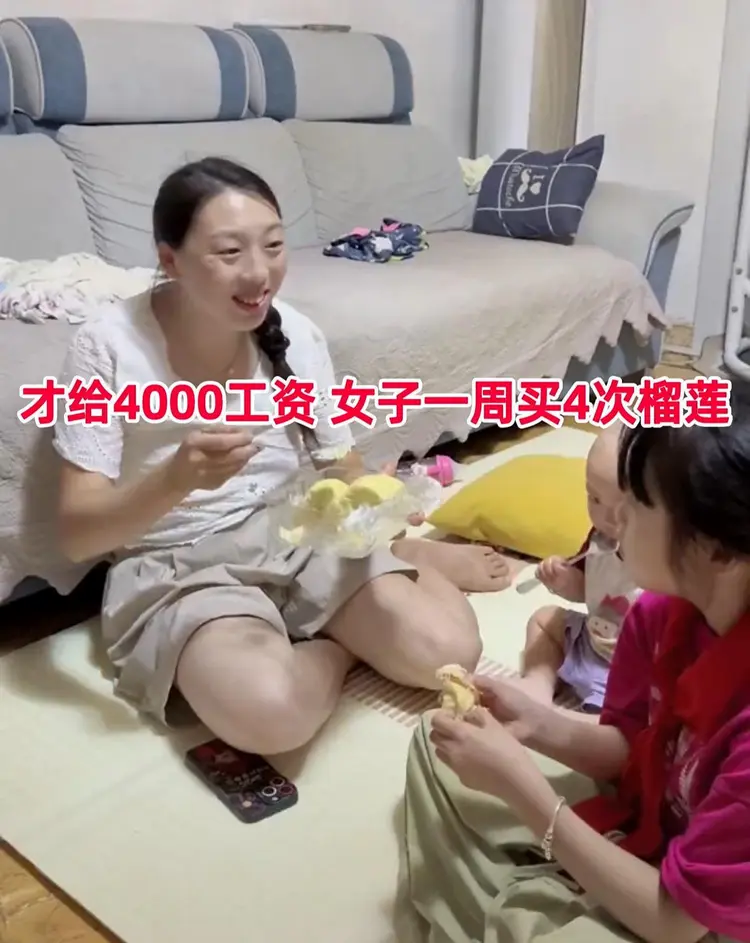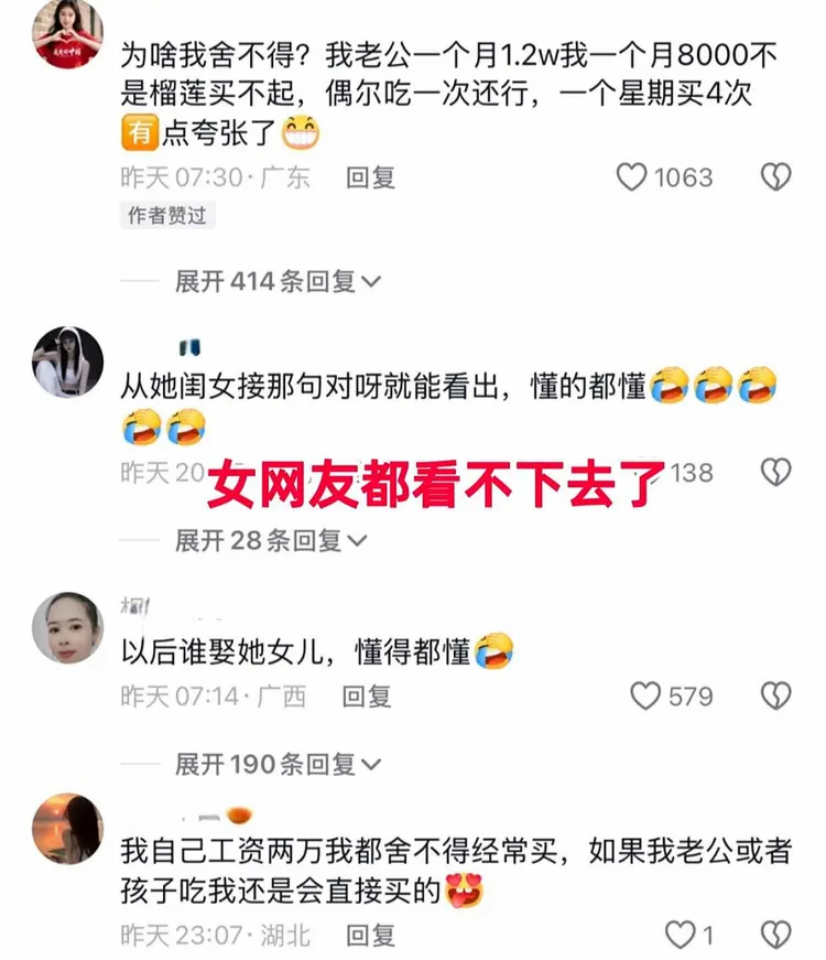 有网友表示:“我的天,我一个月三四万,我媳妇也上班,她都不敢一周吃4次榴莲,那玩意挺贵的,还是我不够努力吧!”