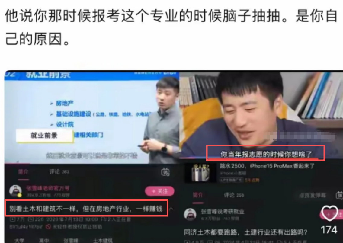 网友翻出的截图显示,张雪峰当年确实强调过‘土木和建筑在房地产行业里一样能赚钱’,但这句话的潜台词是‘行业稳定时’。如今,行业巨变下,曾经的‘金科玉律’已失去效力。