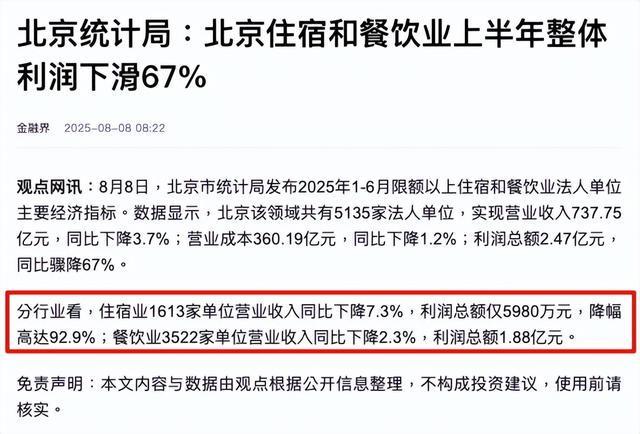 以北京为例,作为商务差旅需求较高的城市,其住宿业经营状况也令人堪忧。据北京市统计局公布的数据,今年1-6月份,1613家住宿业单位加在一起的经营利润仅有5900万,同比爆降92%。