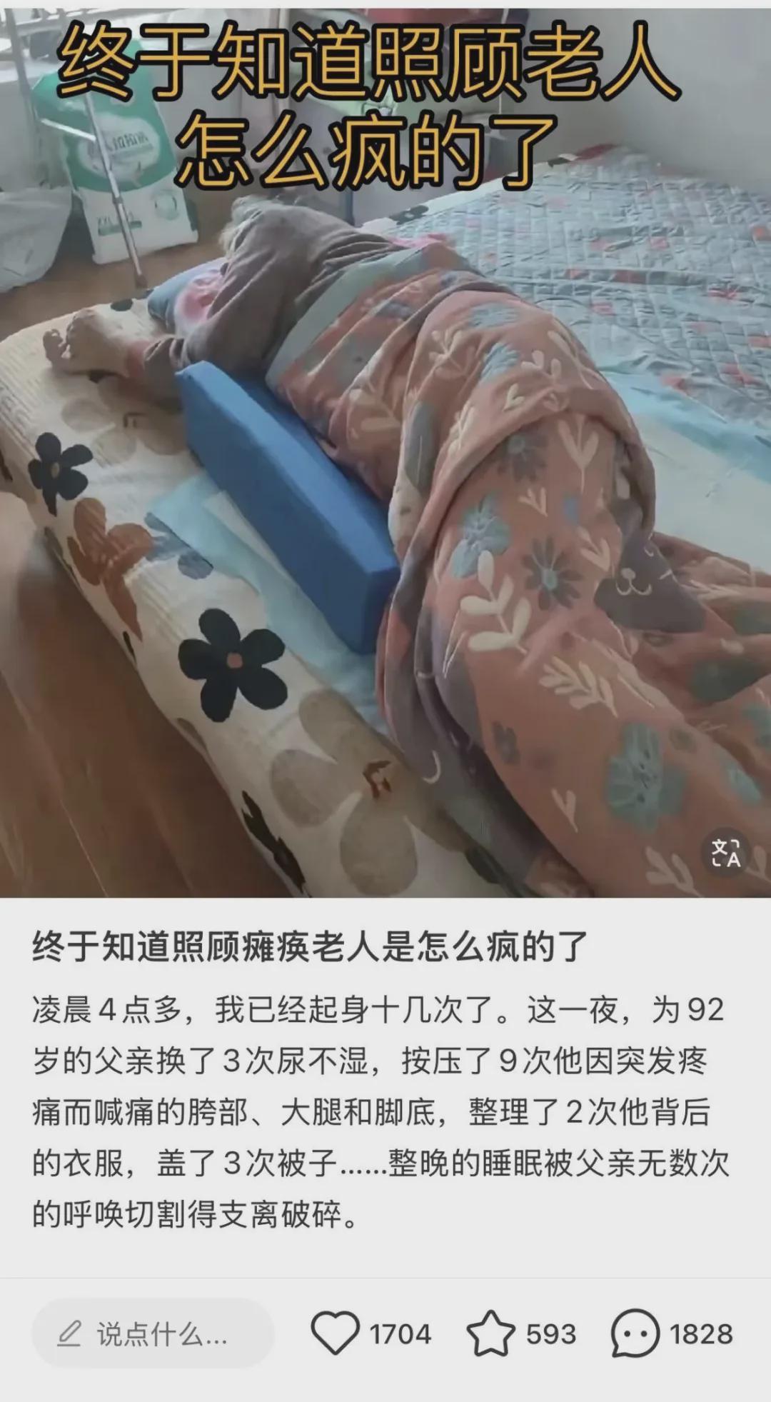 现实中,失能失智老人很少去医院或养老院,多数由家人全程陪护。护理质量参差不齐,许多老人最终在孤独中离世。这种“用子女生命换父母晚年”的模式,正成为越来越多家庭的写照。