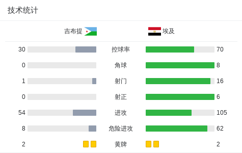 全场比赛结束,吉布提队未能攻破埃及队的球门,最终以0-3的比分落败。埃及队则凭借这场胜利,在预选赛中继续保持领先优势。