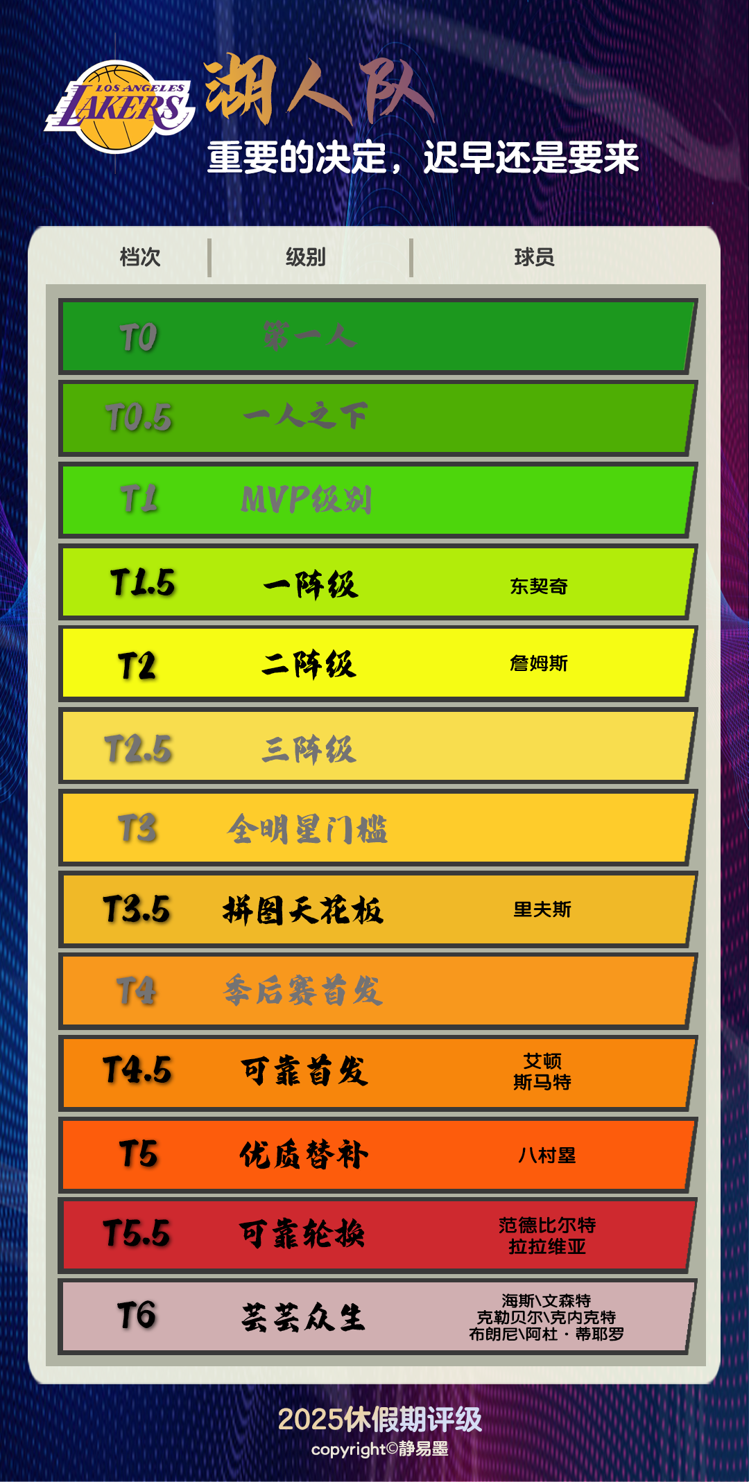 詹姆斯的职业生涯还剩下多少个赛季,这依然是个未知数。但与往年相比,今年的休赛期讨论显得更为平和。湖人的计划与詹姆斯的个人规划并不总是同步,过去几年,“湖人为什么不梭哈”的话题总是伴随着休赛期的讨论,而最终湖人总是以一种看似变动又似乎未变的方式进入新赛季。湖人管理层深知,冲动行事可能带来灾难性后果,如之前“神龟天降”的交易便是前车之鉴。他们明白,为不确定的时间表全力追逐渺茫的机会,并不符合湖人悠久历史和辉煌成就所承载的期望。