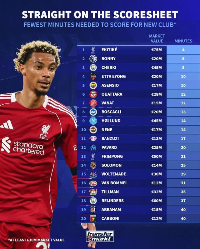 北京时间10月8日,德国转会市场(德转)发布了夏窗新援最快攻入新赛季首球的统计榜单。其中,埃基蒂克以开场仅4分钟的闪电进球荣登榜首,博尼和谢尔基则分别以5分钟和8分钟的成绩紧随其后。