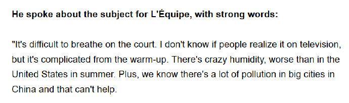 林德克内西表示,自己是被《队报》的记者误导了。他回忆道:“我第二天就给这位记者打电话了,我非常愤怒。采访过程中他一直push我说一些话,比如很潮湿很热啊,我说确实很湿热;他说,而且空气污染肯定让事情更严重吧——我说也许吧。”
