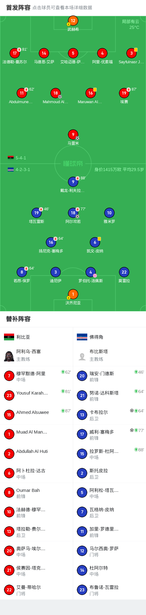 但好景不长,利比亚随后发起猛烈攻势,第42分钟和第58分钟,马雷米和Mahmoud Al Shilw连续建功,将比分扩大至3-1。就在人们以为比赛将失去悬念时,佛得角再次展现出顽强的斗志。先是利比亚门将出现低级失误,送佛得角扳回一分,随后第82分钟,威利-塞梅多再下一城,将比分追至3-3。