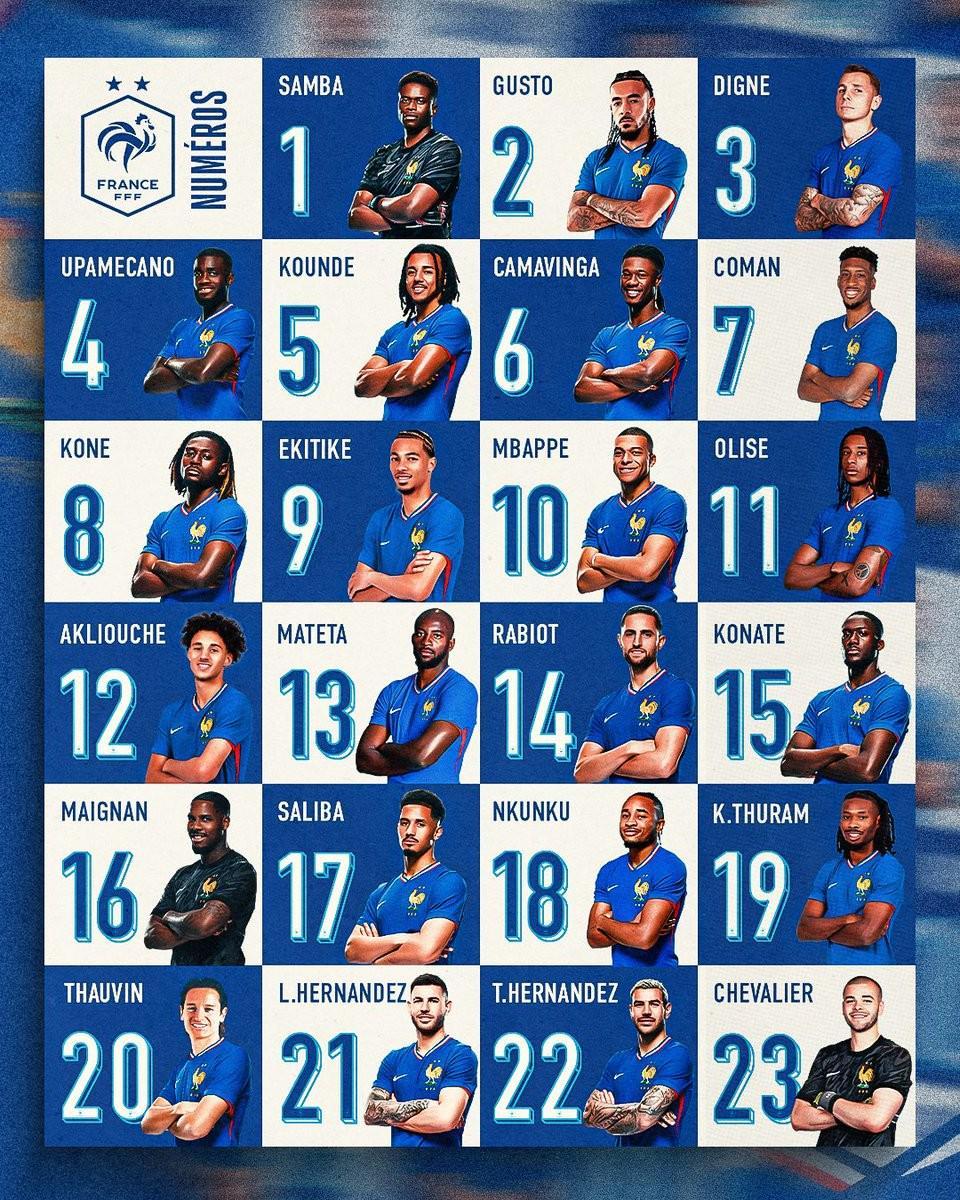 后卫:3-迪涅(维拉)、2-古斯托(切尔西)、21-卢卡斯-埃尔南德斯(巴黎圣日耳曼)、22-特奥-埃尔南德斯(利雅得新月)、15-科纳特(利物浦)、5-孔德(巴塞罗那)、17-萨利巴(阿森纳)、4-于帕梅卡诺(拜仁慕尼黑)