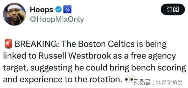 与雄鹿队不同,据美国媒体Hoops报道,凯尔特人队对威斯布鲁克表现出了浓厚的兴趣。凯尔特人队有意在自由市场上签下这位经验丰富的球员,旨在增强球队替补阵容的得分能力与比赛经验。