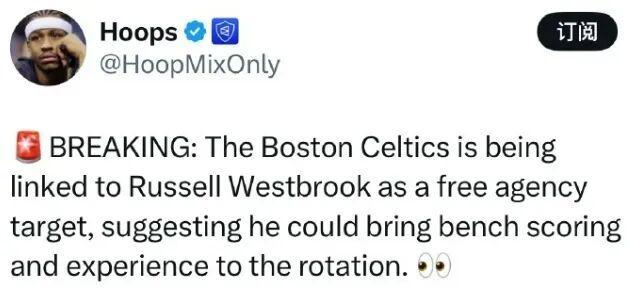 与此同时,美媒Hoops却爆料了一个令人瞩目的消息:凯尔特人队有意在自由市场上签下威少,希望为球队的替补阵容增添得分火力和经验。这一消息对于威少来说无疑是一个好消息,因为凯尔特人队在后场位置上确实显得有些捉襟见肘。