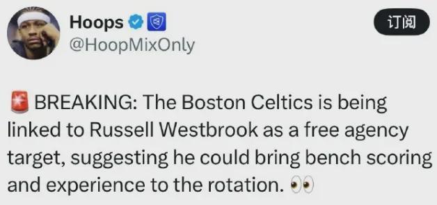 尽管雄鹿目前后场拥有科尔-安东尼、特伦特、罗林斯和小波特四人轮换,看似并不缺人,但凯尔特人的情况却截然不同。据美媒Hoops爆料,凯尔特人正有意在自由市场签下威少,以补强球队的替补阵容,为球队注入更多得分火力和经验。