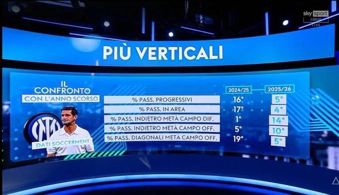 这从数据上就能清晰体现出来。国际米兰向前传球占比、进入对方禁区传球占比和进攻半场斜长传占比三项数据都从上赛季联赛倒数跃升到前5名,而防守半场回传球占比则从第1骤降至14。这说明本赛季的国际米兰回传、横传更少,更加追求向前的纵向传球,皮球也更多出现在对手禁区内。而在逼抢和反击等数据上更是全面提升,特别是逼抢效率提升105%,高位抢回球权后创造的预期进球也提高了85%。