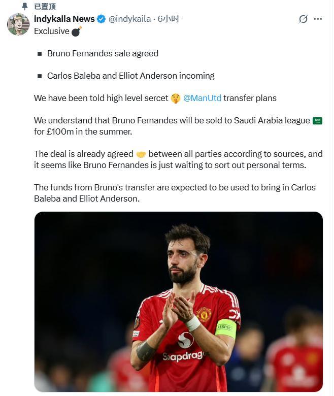 近日,来自知名转会自媒体indykaila News(俗称“绿帽哥”)的独家消息引发了足坛热议。据该媒体透露,曼联已与沙特联赛球队达成协议,将以1亿英镑的天价出售球队队长布鲁诺·费尔南德斯(B费)。目前,双方已就转会费达成一致,B费正在等待个人条款的最终敲定。若交易成功,曼联计划将这笔资金用于引进里尔中场巴莱巴和利兹联新星埃利奥特,以强化球队阵容。