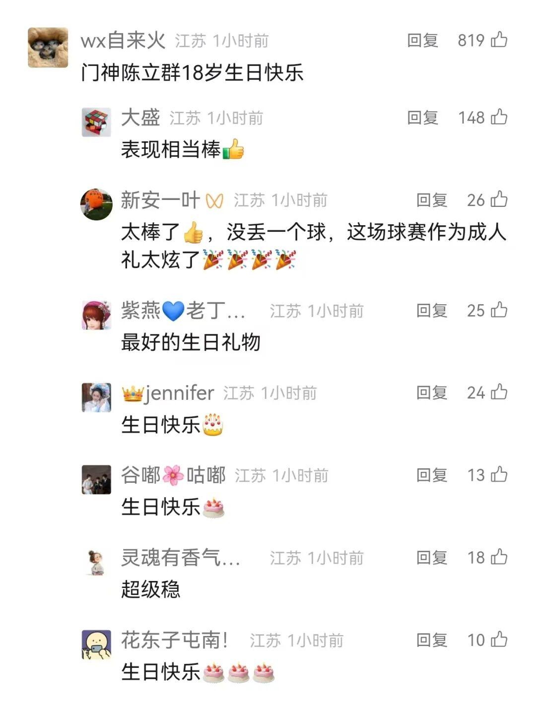 就在这时,看台上的球迷忽然齐声高唱起“生日快乐”歌。原来,今天是球队门将陈立群的18岁生日!陈立群在本场比赛中稳稳守住球门,与队友们默契配合,用一场零封为自己献上了最硬核的成人礼。