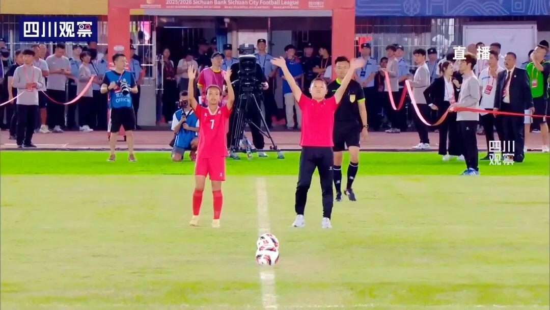 ▲雍旭东与张成珂作为开球嘉宾站上“川超”联赛赛场