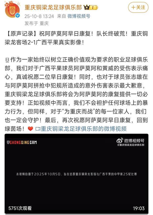 同时,铜梁龙俱乐部表示,对阿萨莫阿的意外伤害“表示最大歉意”,承诺为阿萨莫阿的康复提供一切必要支持。