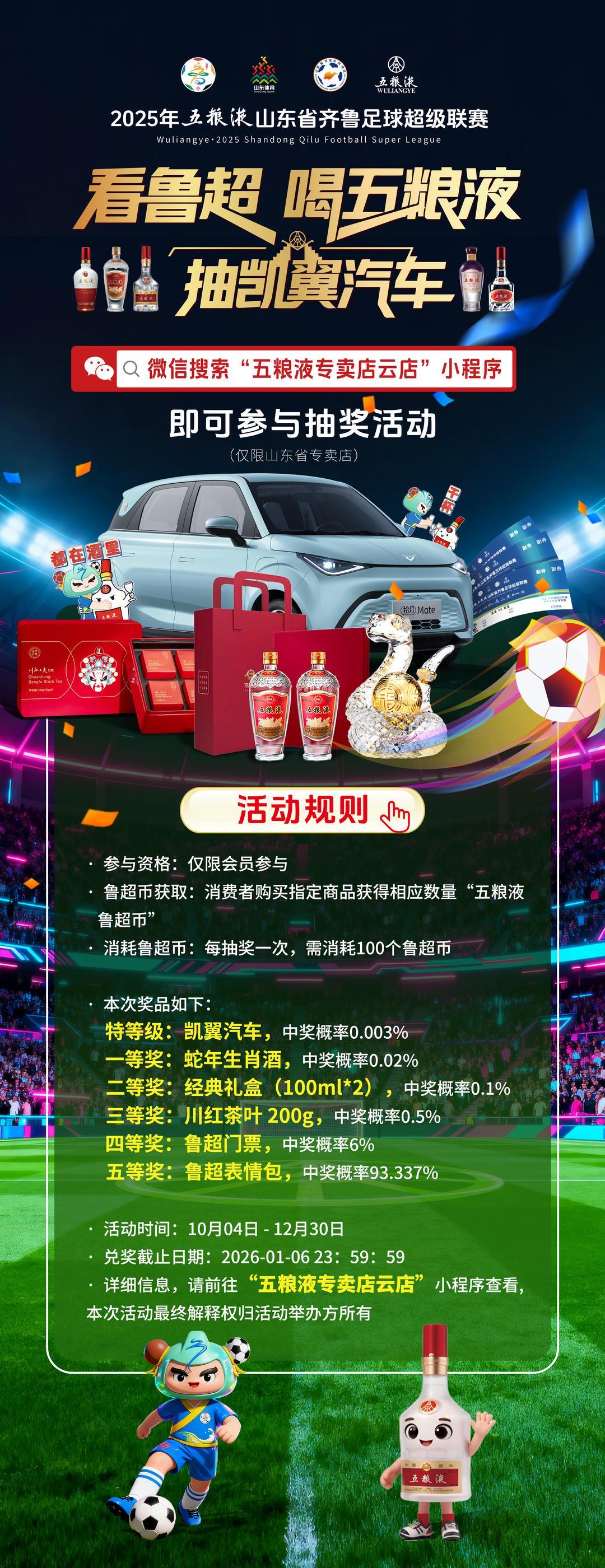 即日起至2025年12月30日,球迷们可通过微信搜索“五粮液专卖店云店”小程序,注册成为会员后,购买指定的五粮液产品即可获得“五粮液鲁超币”。每消耗100个鲁超币即可参与一次抽奖,活动仅限山东省五粮液专卖店。