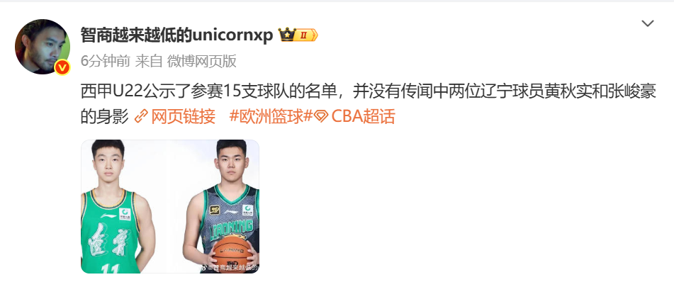 回顾此前,在全国U21青年篮球锦标赛上,山东男篮与辽宁男篮之间发生了一场大规模冲突,多名球员因此遭遇重罚。其中,辽宁男篮球员黄秋实和张峻豪更是被处以禁赛3年的严厉处罚。然而,就在不久前,辽宁媒体人“田掌门”曾率先爆料称,张峻豪和黄秋实有望登陆即将在秋天开打的西班牙U22联赛,这一消息随后也得到了其他辽宁媒体人的确认。