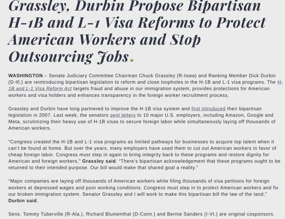 美国参议员Chuck Grassley与Dick Durbin重新提交《H-1B/L-1签证改革法案》,提出将H-1B初始期限缩短为三年,仅在雇主递交并获批I-140永久居留申请后,方可延长三年。法案同时强化工资审查与合规要求,限制外包公司转派员工,并要求优先雇用美国劳工。两位议员称,该法案旨在“修补被滥用的签证制度”,防止“廉价外包取代美国岗位”。律师界认为,这一变革将使签证续期与绿卡进度强绑定,留学生从OPT转H-1B的时间压力显著上升。