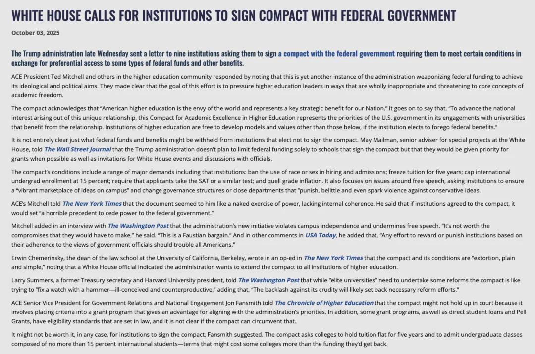 美国高等教育协会(ACE)发布分析文件,详细列出白宫“公约”要求:签约高校须在学费管控、招生公平、性别平权及“安全言论”政策上遵循联邦标准,换取更优联邦资金与行政便利。ACE汇总了各界反应,指出大学普遍担忧该模式或成为未来政策“样板”,削弱大学董事会与学术委员会权力。协会呼吁恢复“教育政策的非党派传统”,防止高教沦为政治战场。