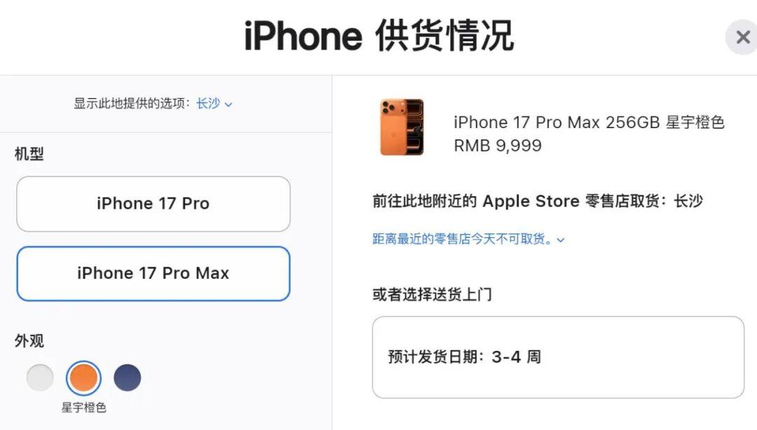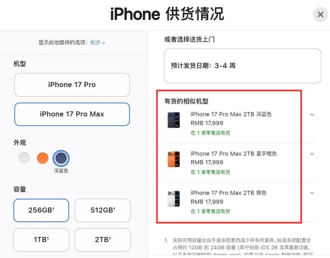 机哥在国庆假期查询苹果官网iPhone17ProMax供货情况时,发现长沙苹果线下零售店只有2TB版深蓝色iPhone17ProMax有货。