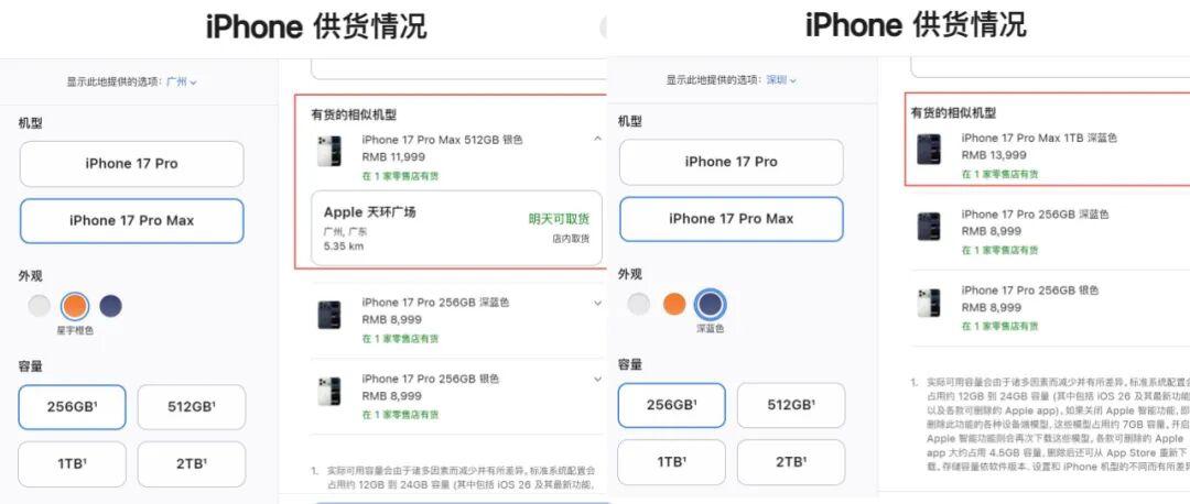 而深圳苹果线下零售店,1TB深蓝色iPhone17ProMax也是有现货的,下单后就能入手。