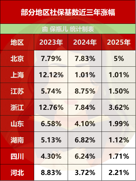 我统计了部分省市近三年的社保上涨幅度。