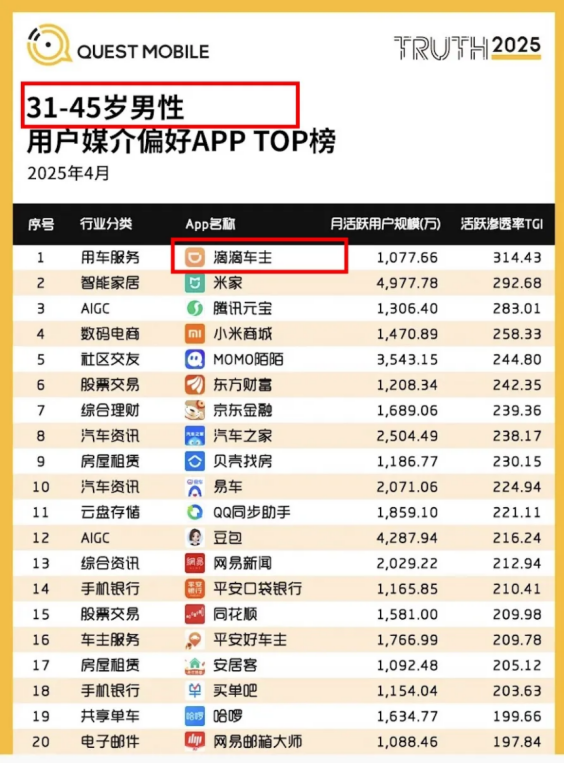 31岁到45岁男性用户的偏好榜,居然是滴滴车主排上了第一,月活用户超过了1千万。