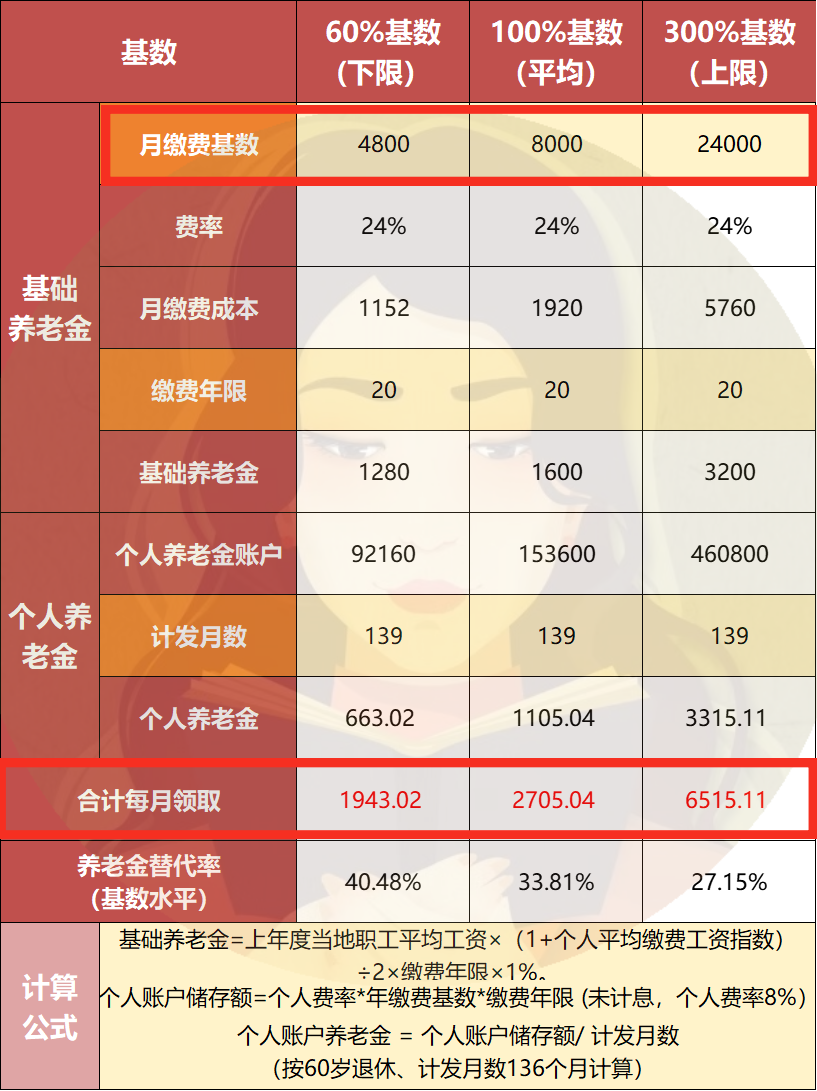 举个例子,按社平工资8000、最低基数4800来算,基数上限就是24000。